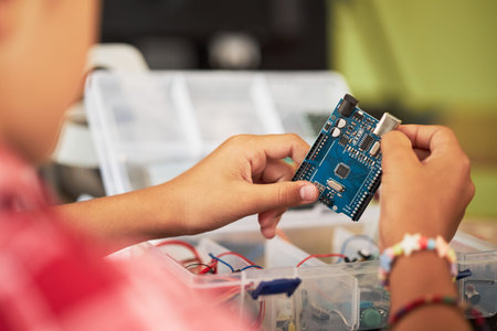 Teenager boy with tan skin assembling electronic circuit board, holding microcontroller with both hands, working on robotics project, visible hands and partial face, focusing on technology