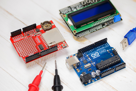 Brest, Belarus - August 22, 2017: Arduino UNO PCB board and another shields for programming education development