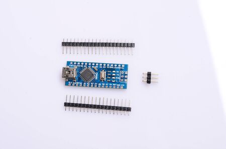 Microcomputer closeup on white background. small breadboard with its own processor and memory. Is good for building prototypes of electronic devices.