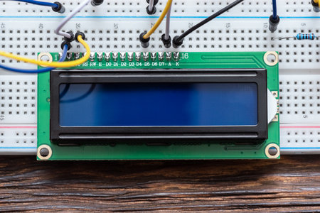 Closeup on electronic board in hardware repair shop. Breadboard with special cables and led. Electronics diy development