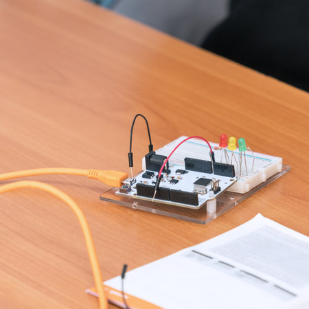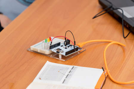 Close up of circuit board with wires and cables in robot engineering class or workshop activity