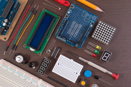 Engineer workplace. Top view of disassembled microcontroller, electronic components and wires.