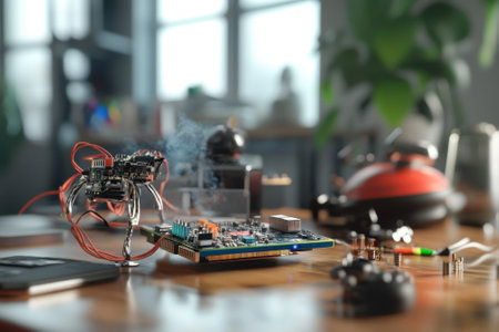 An electronic circuit board and various components are showcased, illuminated by a combination of red and blue light. The image highlights a complex arrangement of wires, panels, and equipment, indicating a possible laboratory or workshop setting. This composition may be suitable for illustrating technology, innovation, or research concepts in commercial contexts.