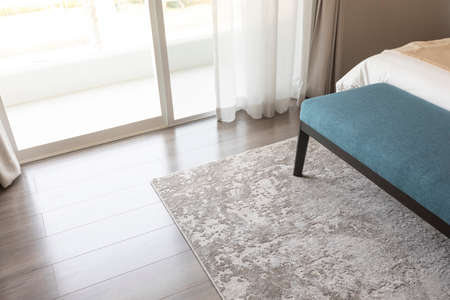 Beautiful soft carpet on wooden floor, closeup