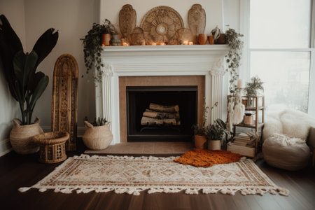 Stylish modern living room with bohemian decor and comfortable seating arrangement