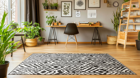 This image showcases a cozy modern workspace featuring a stylish black and white area rug, indoor plants, and minimalistic decor that creates a serene atmosphere.