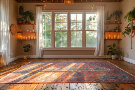 A stunning Oriental carpet lies gracefully in a bright hallway, complemented by a vibrant flower pot. The soft natural light highlights the intricate patterns and colors, creating a warm and inviting atmosphere that enhances any home decor.