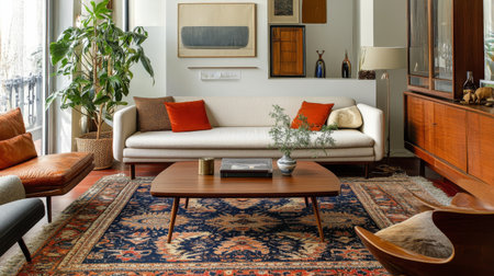 A well-decorated living room with a mix of vintage and modern furniture, including a mid-century sofa, an antique coffee table, and a decorative rug, highlighting eclectic style.