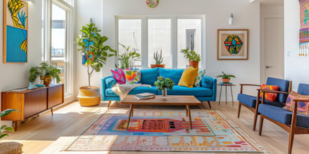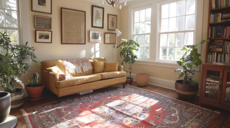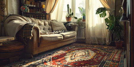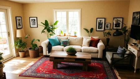 A cozy living room featuring a stylish sofa adorned with cushions, a vibrant rug, and lush plants basking in natural light, creating a warm atmosphere.