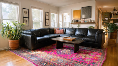 Family-friendly living room featuring a soft black leather sectional sofa and colorful rug on wooden floor