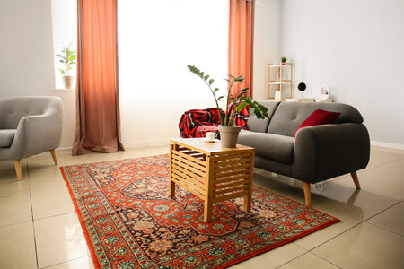 Interior of cozy living room with vintage carpet, table and sofa