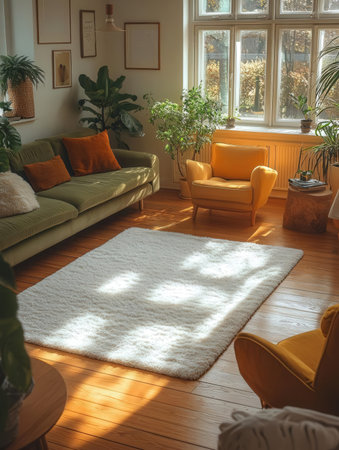 Sunlight streams through large windows, casting gentle shadows across a cozy living room adorned with plants and soft furnishings. The inviting space exudes tranquility and warmth.