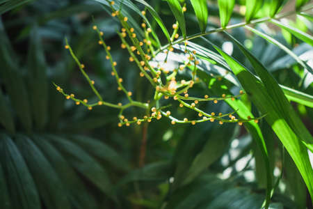 Blooming branch of chamaedorea plant litted with sunlight