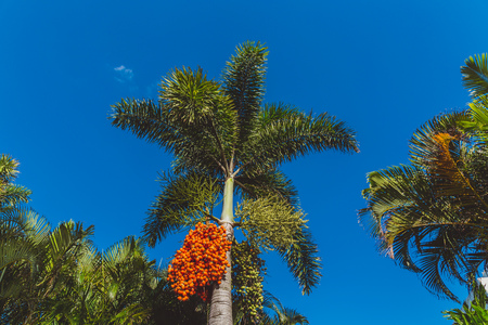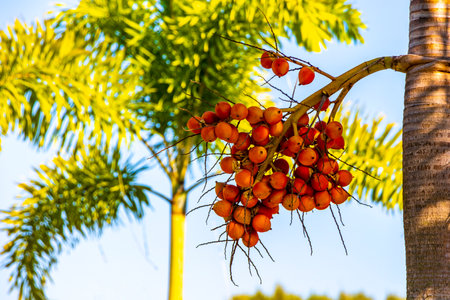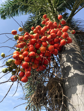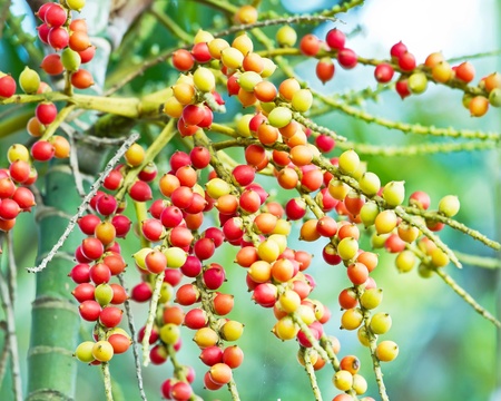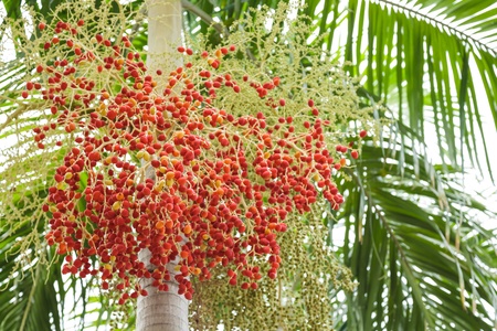 Red plam oil and ripe betel nut fruit on tree. (Manila Palm -Veitchia Merrillii)