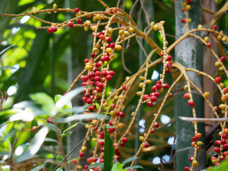 Red and brown Areca nut palm, Betel Nuts, Betel palm (Areca catechu) hanging on its tree