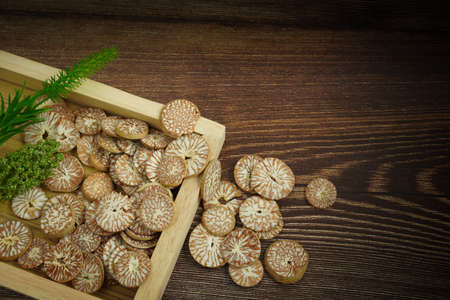 Areca catechu or areca catechu,selective focused photo , cut into thin sheets, placed in wooden trays, free space, is a perennial palm tree, native to tropical Asia.