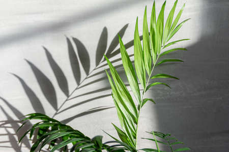 palm leaf against gray textured background with deep long shadow and natural sunlight