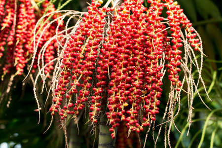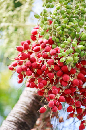 fresh betel palm bunch red fruits of decorative plant, red betel palm on the palm tree under natural sunlight and environment.