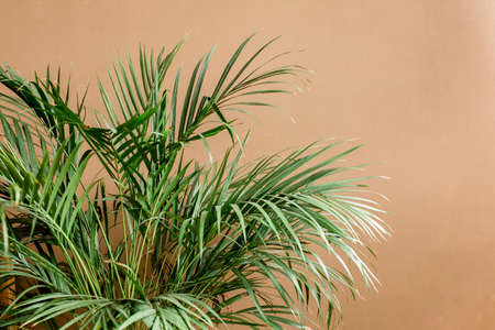 Exotic tropical green palm leaves, branchs on brown background with blank space for text. Flat lay, top view