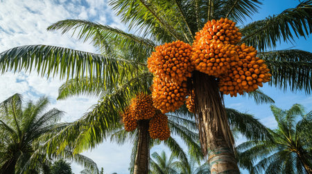Tropical palm oil trees with ripe orange fruits clustered at the top, ready for harvest, symbolizing agriculture, industry, and natural resources
