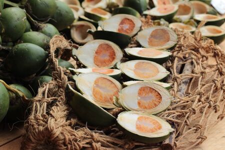 Group of slice Betel nut fresh betel palm on wooden