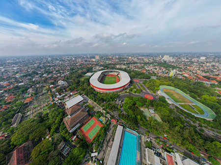 Aerial top down view of the Beautiful scenery of Manahan Solo Stadium. with cityscape background. Solo, Indonesia, July 1, 2021