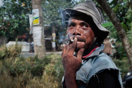 Portrait of a typical rural woman in Indonesia. Portrait of an Indonesian female farmer wearing typical Indonesian village clothes. The background is rural and outdoor rice fields.