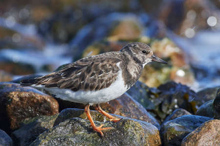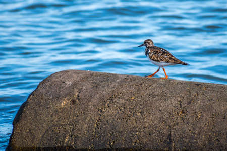Ruddy turnstone wading bird, Arenaria interpres, foraging in between the rocks at the shore. These birds live in flocks at shore and are migratory.
