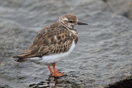 Ruddy Turnstone, Arenaria interpres, searching for food at sea shoreline, close-up portrait, selective focus, shallow DOF.
