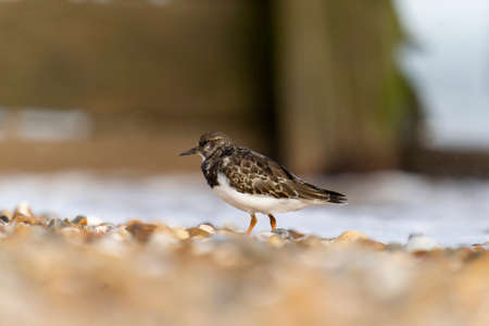 Ruddy turnstone (Arenaria interpres) shore bird feeding on coast. Wildlife scene in nature of Europe. Netherlands.