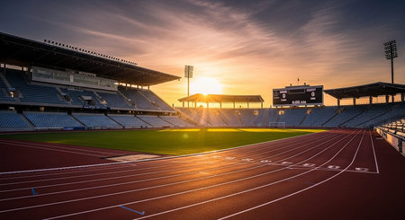 Empty athletic stadium with running track and stadium lights during a vibrant sunset