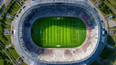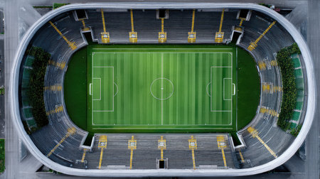 Stunning aerial view showcasing a modern sports stadium with a pristine green grass field and meticulously arranged empty seats, ready for upcoming events.