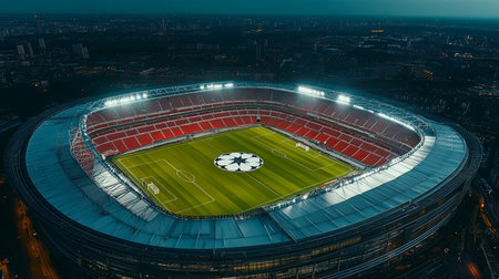 A stunning aerial shot of a vibrant stadium at night, filled with excited spectators. The bright lights illuminate the field, creating a captivating scene.