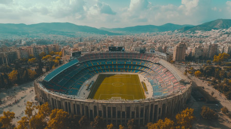 Captivating aerial view of a stadium at sunset, showcasing the empty field and surrounding cityscape. The warm light enhances the architectural beauty.