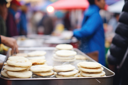 Get a taste of El Salvador with Pupusas, a thick and doughy corn tortilla stuffed with a savory mixture of cheese, beans, or pork. Served with a side of spicy sauce and a simple salad of lettuce and tomatoes, this dish is perfect for a savory and satisfying meal. Captured in bright and natural lighting, this close-up shot highlights the texture and colors of the food, while the lively and colorful street food scene in the background adds to the festive atmosphere.
