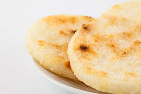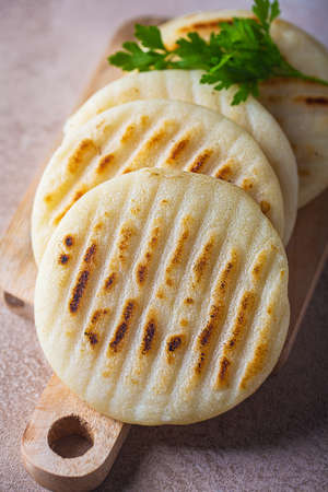 Arepa is a type of meal made from ground corn dough, cornmeal, traditional cuisine of Colombia and Venezuela, close up
