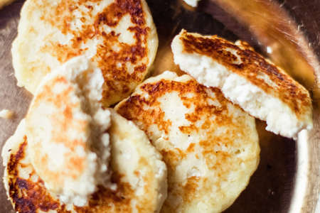 Lactose free, low carb cottage cheese pancakes, cookbook recipe - healthy nutrition, rustic and traditional food concept. Your favourite homemade breakfast is served