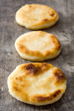 dough cornmeal Arepa on wooden table, traditional in the cuisine of Colombia and Venezuela