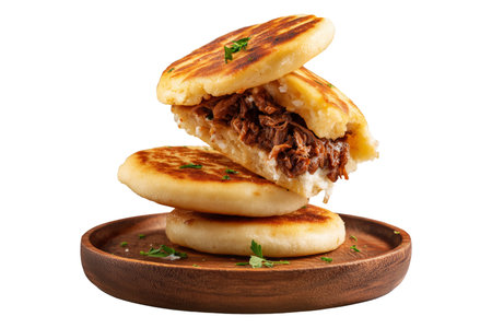 Grilled arepas plain sandwich filled with melted cheese and ground beef on wooden plate, isolated on white transparent background, concept of Latin street food