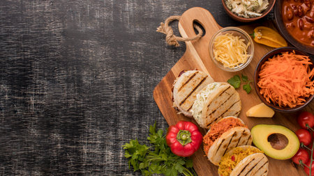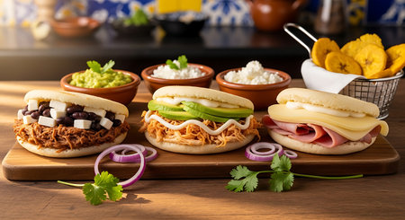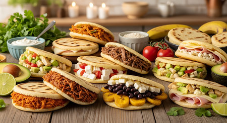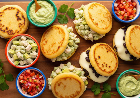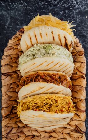 Traditional Venezuelan arepas with various fillings, top view with space for copy.