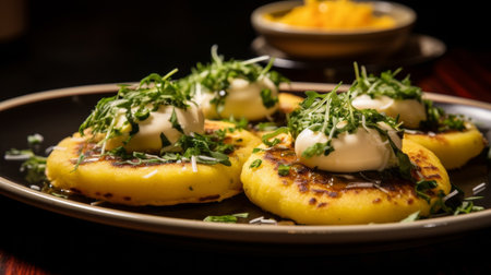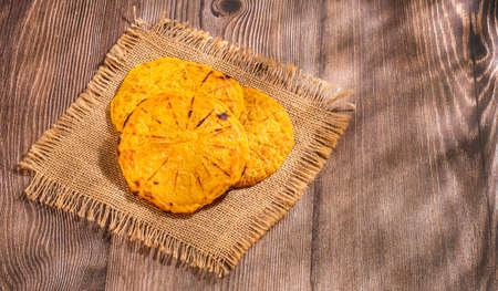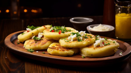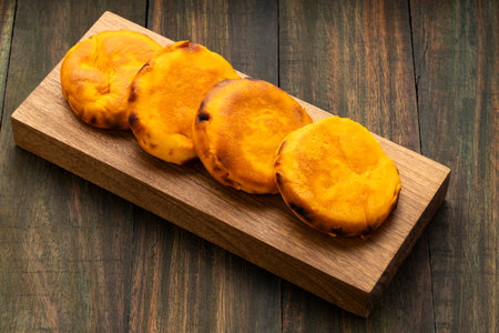 The Luruaco Egg Arepas. Colombia Pancakes with cottage cheese on a dark wooden background. Selective focus.