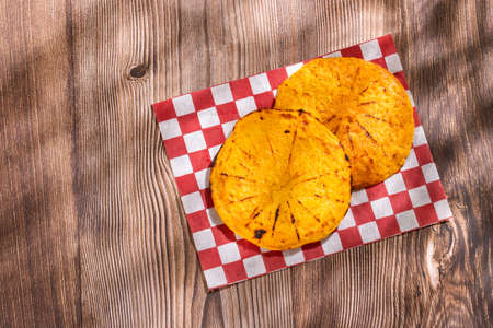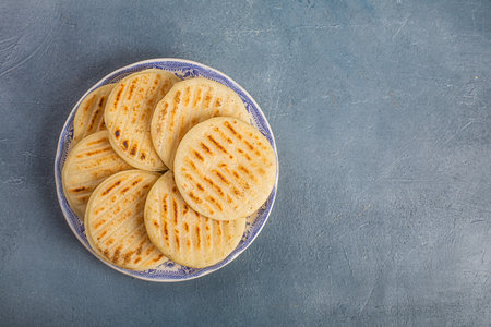 Top view of arepas, breakfast in Colombia and Venezuela, made with corn flour