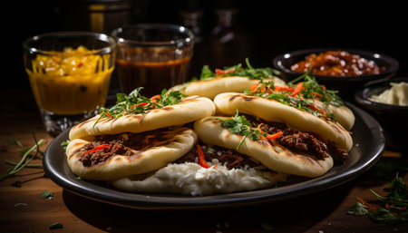 Arepa with rice and vegetables on a wooden table in a restaurant. AI Generative