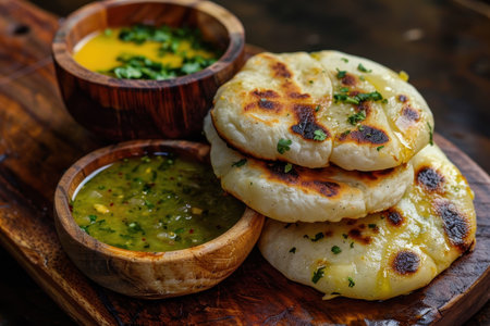 Assortment of venezuelan arepas with various fillings. This traditional south american food is served with guasacaca and salsa dips.