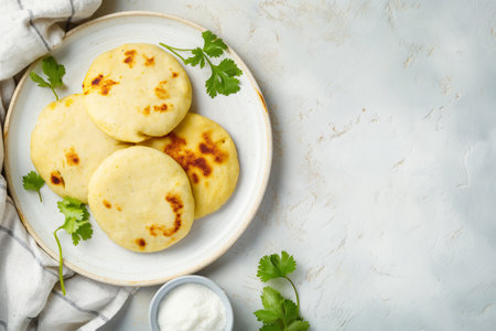 Arepa is a type of meal made from ground corn dough, cornmeal, top view with copy space
