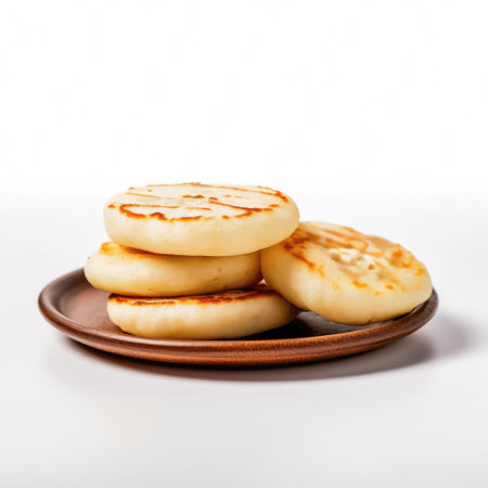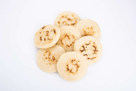 Stack of arepas made with corn flour on a white background, typical Latin American food. They are generally eaten in countries such as Venezuela