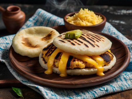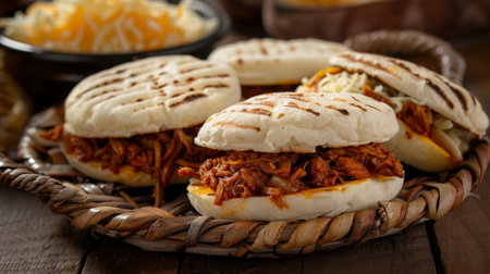 Venezuelan arepas, cornmeal cakes stuffed with cheese, pulled pork, or beans, served on a woven basket. A traditional and flavorful dish from Venezuela