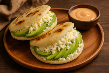 Two freshly made arepas filled with creamy avocado slices and crumbly cheese, served on a wooden plate with a side of dipping sauce