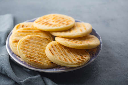 Arepa is a type of meal made from cornmeal, traditional in the cuisine of Colombia and Venezuela on a gray background