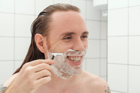 Man with lots of shaving foam on his face standing in bathroom, looking at mirror, shaving his face beard. Skincare
